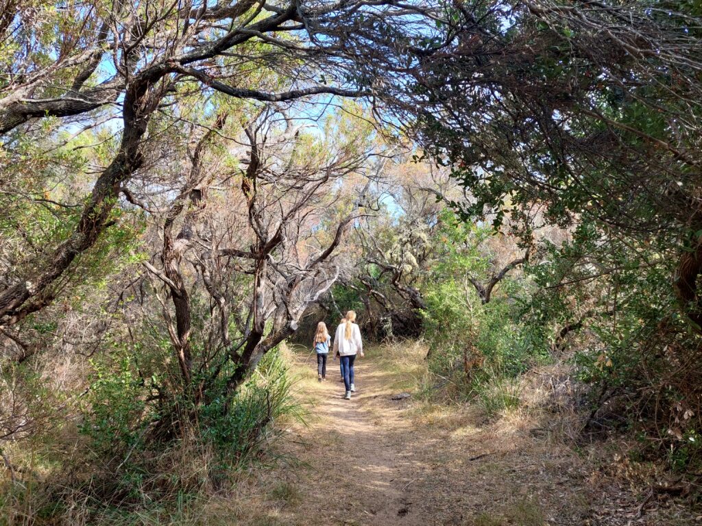 Auf der kleinen Wanderung, die vom Campingplatz ausgeht, läuft man durch den flachen Küstenwald und es erschließt sich sofort warum es bei den Australiern ‚into the bush‘ heißt.