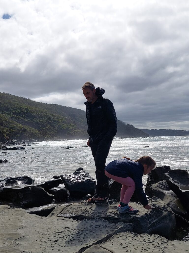 Und dann sind wir weiter in den Great Otway Nationalpark gefahren. Hier haben wir zwei Nächte auf verschiedenen Campingplätzen verbracht, da nichts anderes frei. Was uns erst etwas geärgert hat, stellte sich als großes Glück heraus. Am Aire River gibt es nämlich neben einer tollen Lage am Fluss viele Koalas, die direkt in den Bäumen am Campingplatz leben. So sahen wir am Abend eine Koalamutter mit Baby und am nächsten Morgen ist uns, neben einem Wallaby, dann auch ein großer männlicher Koala direkt vor Anna und mir aus dem Busch geklettert und über den Weg in den nächsten gelaufen.