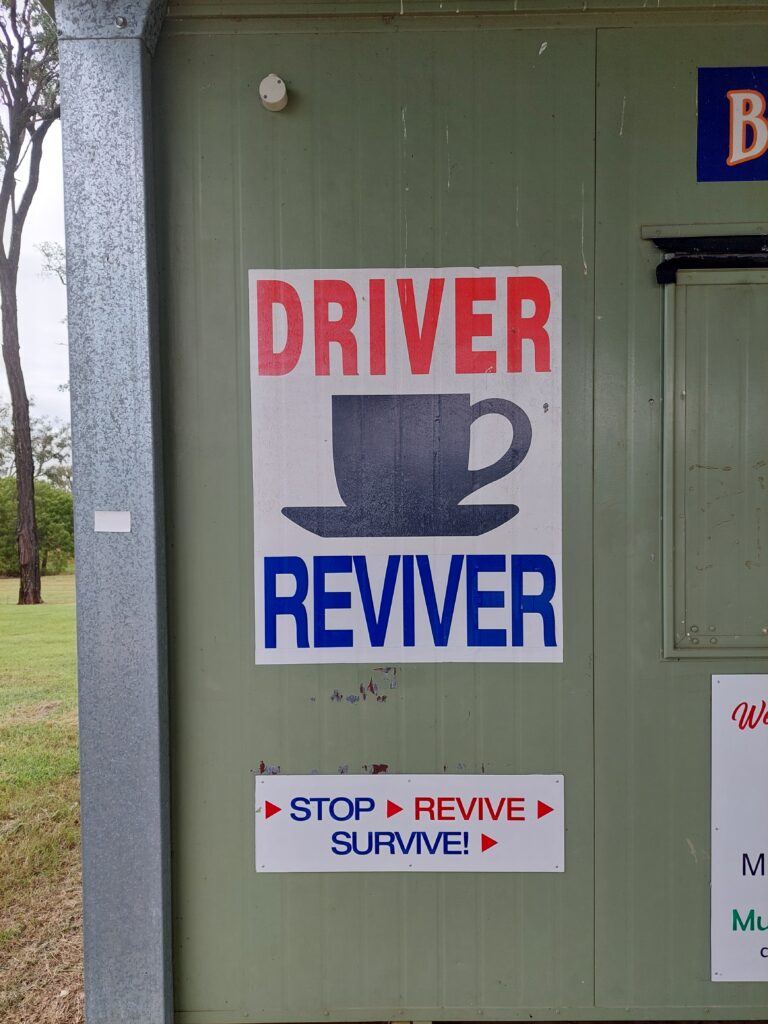 Im Auto auf der Fahrt merkten wir schnell, dass das Outback zumindest in diesem Teil von Queensland nicht wüstenartig, sondern sehr buschig ist. Aber weit, weit ist es trotzdem. War die Landschaft im Süden schon weitläufig, sind die Entfernungen hier oben riesig und die Straßen eintönig einlullend. Kein Wunder, dass hier, mehr noch als im Süden, auf vielen Schildern am Straßenrand für regelmäßige Pausen geworben wird. Hier gibt es an einigen Rest Areas kleine Kioske, die zu den Öffnungszeiten gratis Kaffee an Trucker ausschenken. Der Sekundenschlaf gehört zu den häufigsten Unfallursachen. Das ist leicht nachvollziehbar, wenn man vor der nächsten Kurve gerade mal wieder 10km geradeaus gefahren ist .