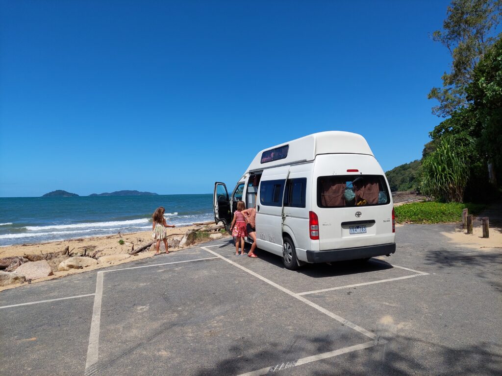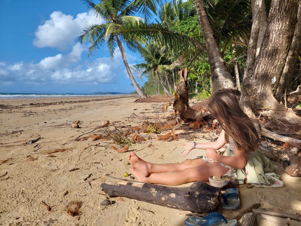 Am Strand in Mission Beach habe ich mich zum wiederholten Mal darüber gefreut, wie wenig ‚Material‘ die Kinder brauchen um gut spielen zu können. Eine Freundin hatte vorher gefragt, wie wir das mit dem Spielzeug machen, wenn wir mit dem Rucksack unterwegs sind. Wir haben im Kita Rucksack von Anna einige Kartenspiele, Malsachen und ihre Schleich-Tiere dabei. Der Ball ist im Camper geblieben und wird ab und zu vermisst. Ansonsten suchen sie sich die Dinge, die sie zum Spielen brauchen in der Umgebung und es funktioniert ganz wunderbar! Anna sagt zwar hin und wieder, dass sie sich auf ihr Playmobil Puppenhaus freut, spielt aber auch fein ohne. So gut, dass ich mich mehr als einmal gefragt habe, warum zu Hause das ganze Haus voller Zeug ist?!? Wenn jetzt auch noch das Zanken zu Hause geblieben wäre, bliebe ich am Strand….