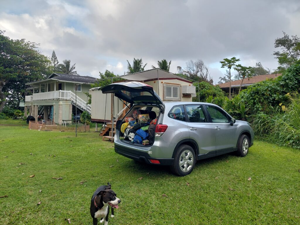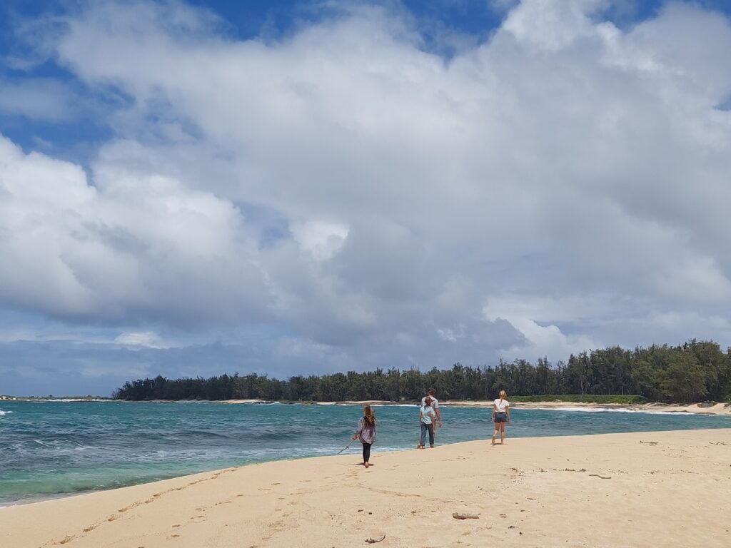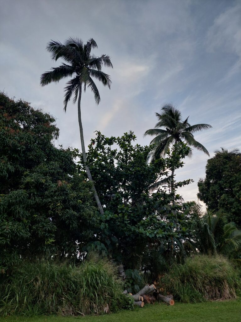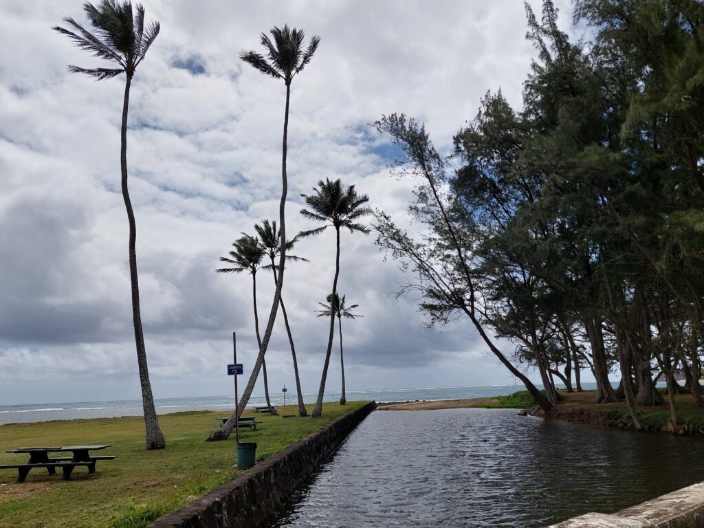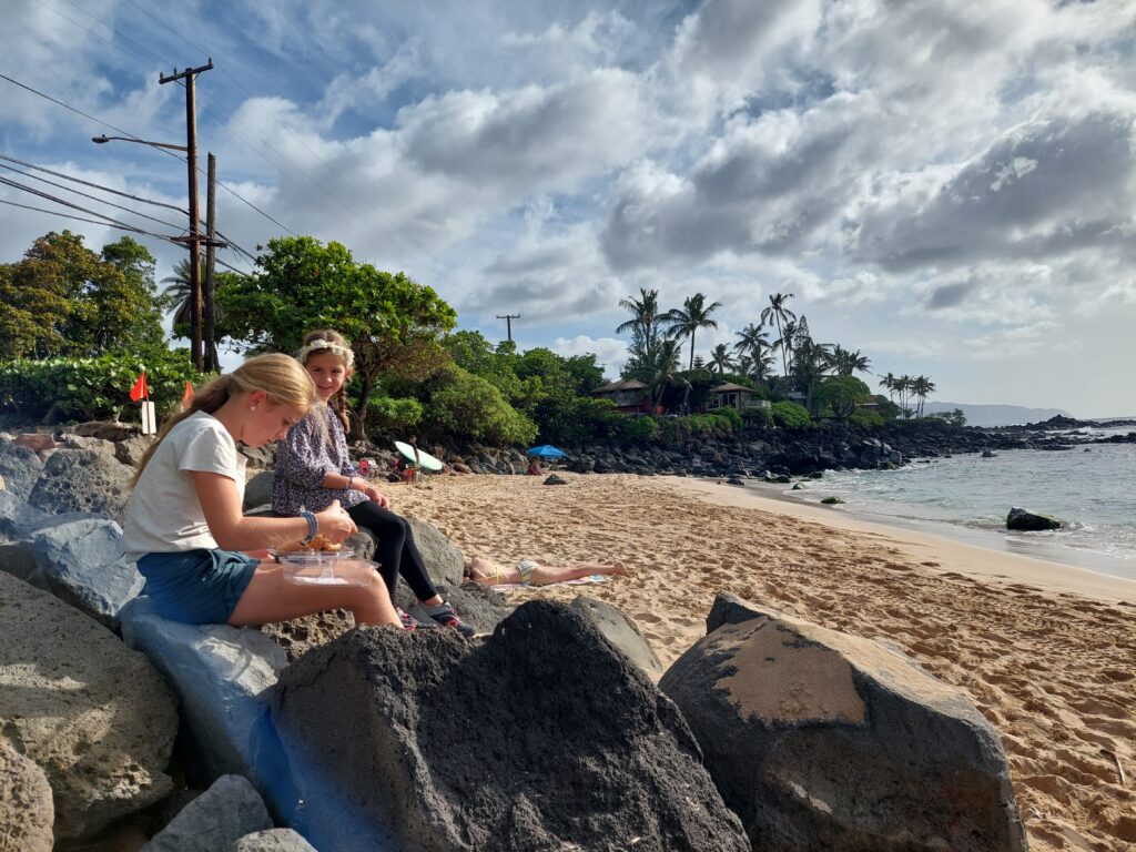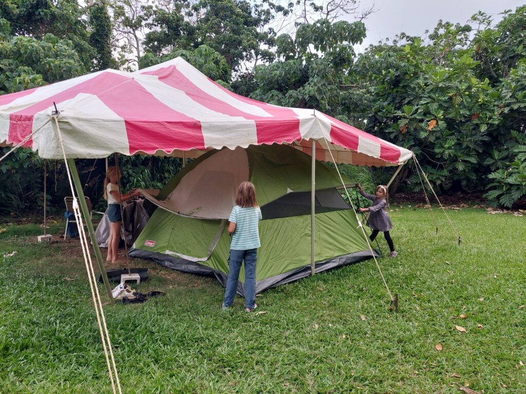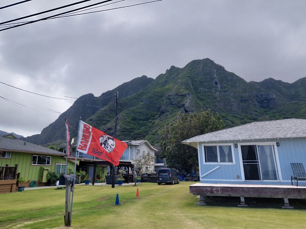 An der Nordostküste von O’ahu haben wir dann auf dem Grundstück von Michael zwischen Mangobäumen, Bananenstauden und ganz vielen Hühnern unser Zelt zum ersten Mal aufgebaut. Für alle, die länger bleiben hat er vorgesorgt. Man darf unter der Zirkusplane aufbauen, falls es Regen gibt. Wir merkten ziemlich schnell, dass dieses ‚falls‘ mehrfach am Tag der Fall ist. So war es ziemlich gut, dass Michael vorgesorgt hatte und wir immer im Trockenen essen konnten.