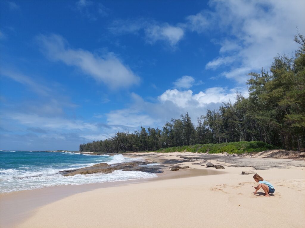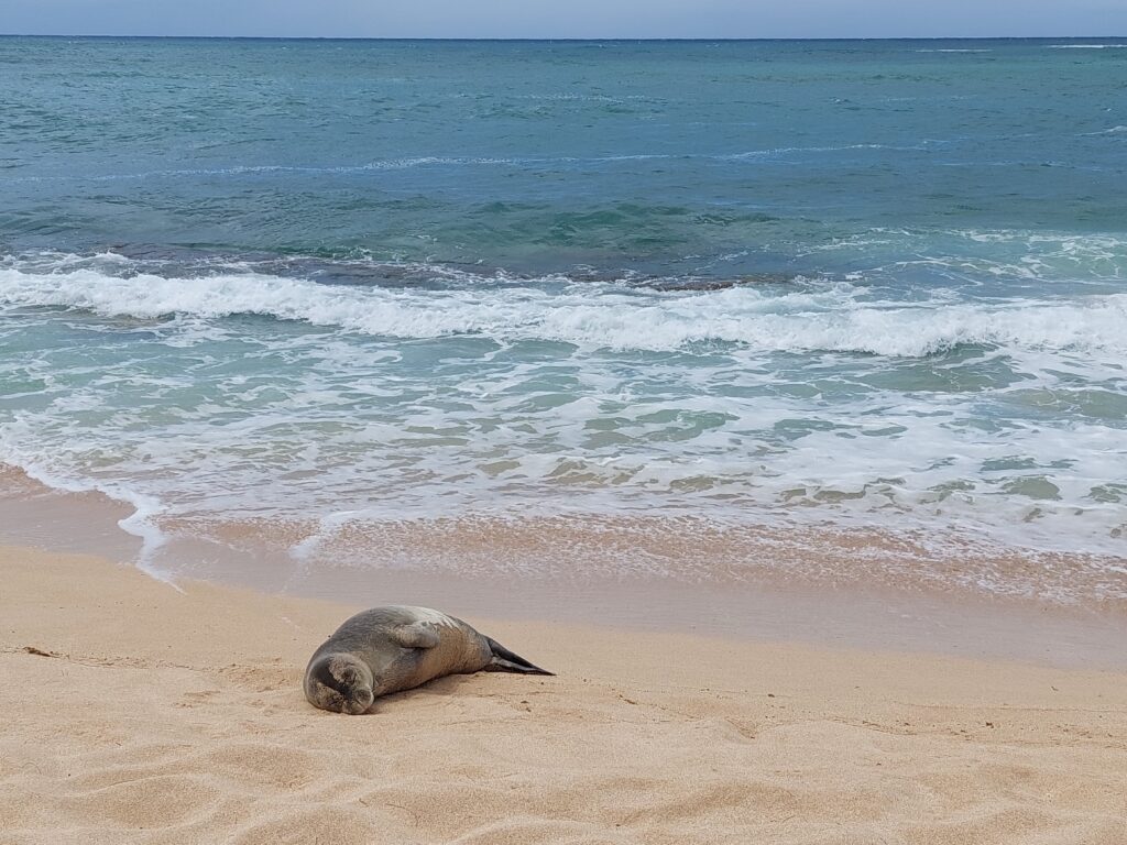 Am Turtle Beach haben wir statt hawaianischer Meeresschildkröten eine hawaianische Mönchsrobbe gesehen und haben das erste Mal gemerkt, wie Brandung und Strömung auf Hawai sein können.