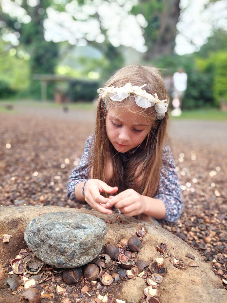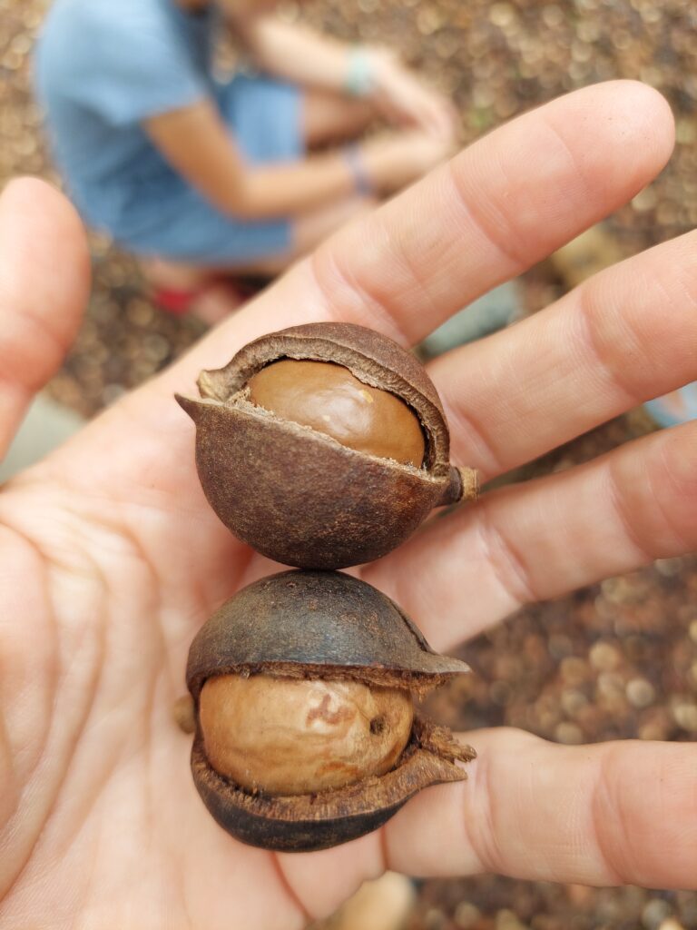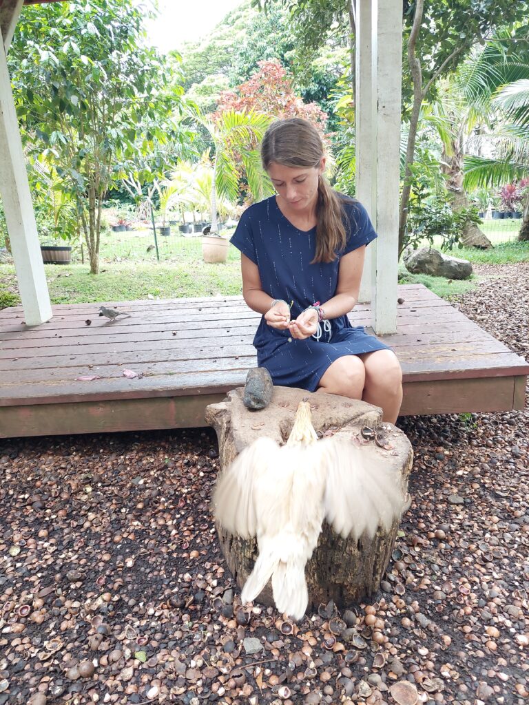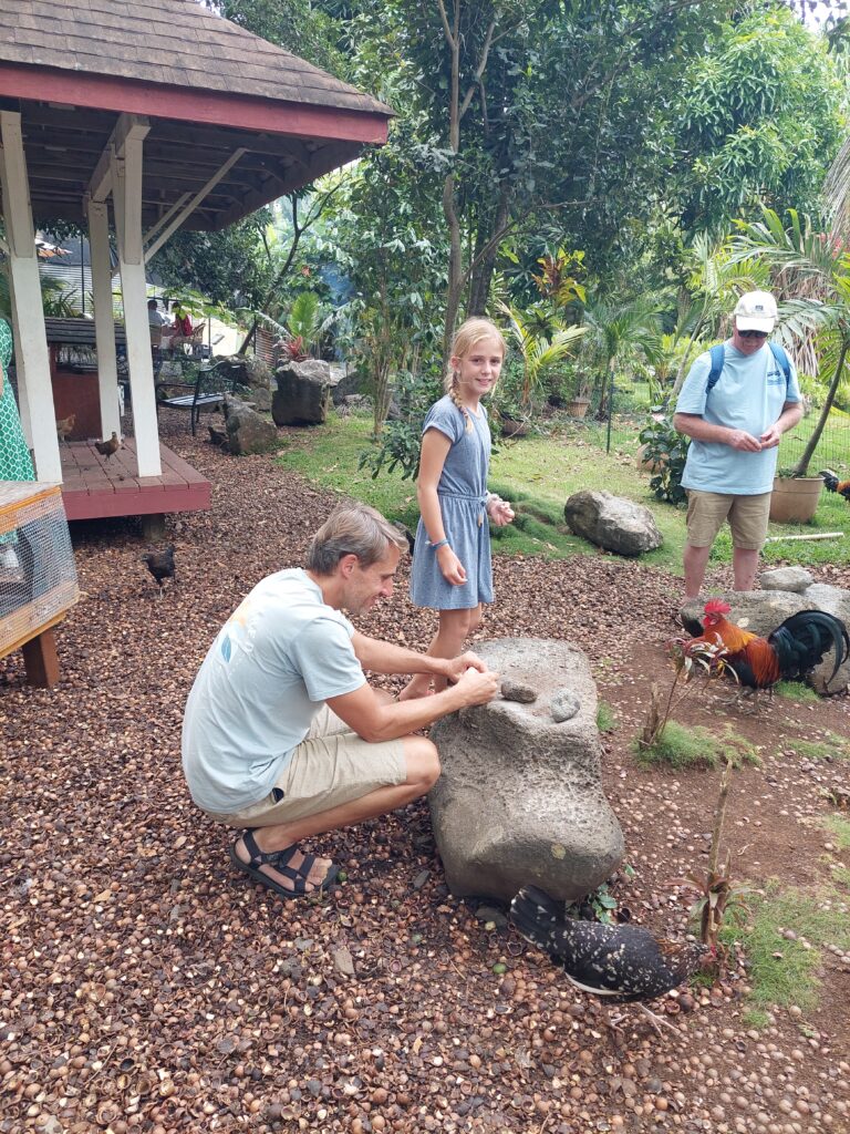 Macadamianüsse zum Selberknacken und natürlich wissen auch die Hühner, dass die lecker sind. Die freilaufenden Hühner sind nicht nur hier überall, sondern wirklich überall. Selbst im Park am Waikiki Beach leben Hühner.