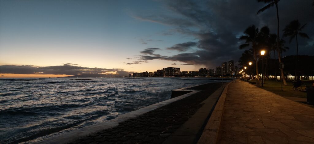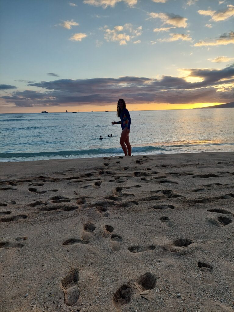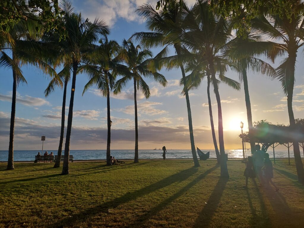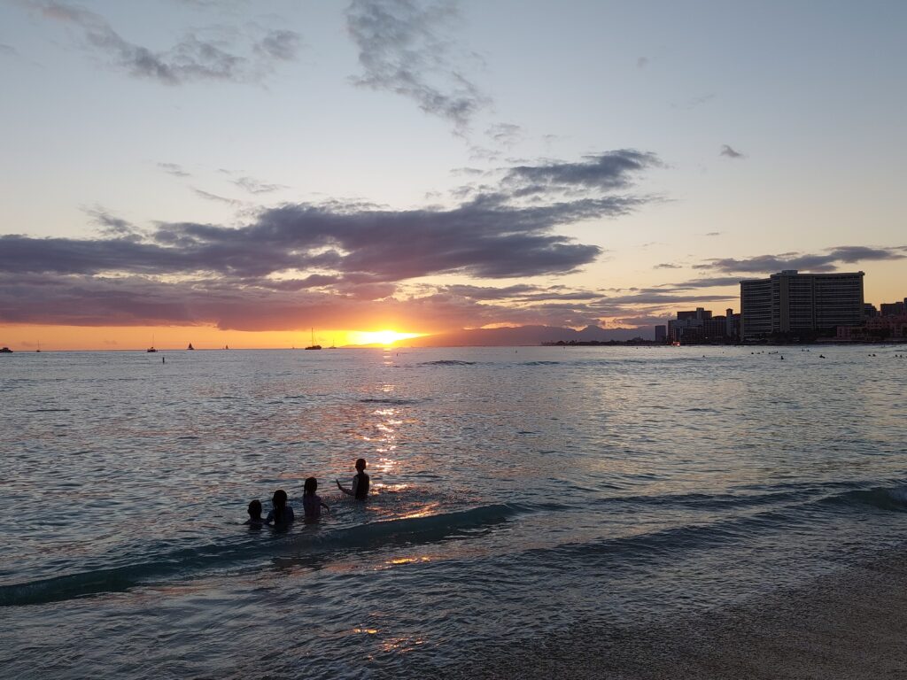 Unseren letzten Abend auf O’ahu haben wir dann am Waikiki Beach verbracht. Nachdem die Kinder im Flugzeug Werbefilme für Waikiki in Dauerschleife gesehen hatten konnten wir nicht daran vorbei. Wollten wir aber auch gar nicht. Die großen Hotelketten am Strand, schicken Restaurants und glitzernden Boutiquen sind zwar in unserer derzeitigen Reisekonstellation kein Ziel. Es war aber trotzdem schön es gesehen zu haben. Man könnte anhand der Bilder vermuten, dass wir es auf den Sonnenuntergang am Strand angelegt hatten…in echt waren wir einfach wieder einmal ziemlich spät dran für einen Strandnachmittag. Was oft zu ärgerlichem Kochen im Dunkeln führt, sorgt eben manchmal auch für die spektakulärsten Bilder zum Abschied .