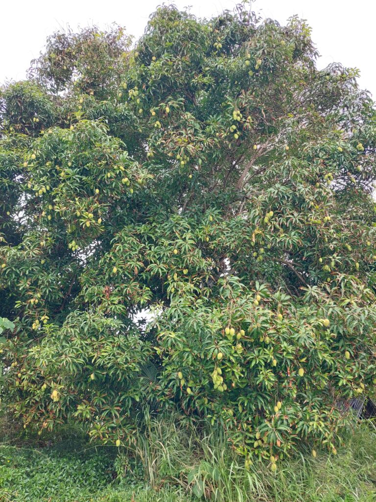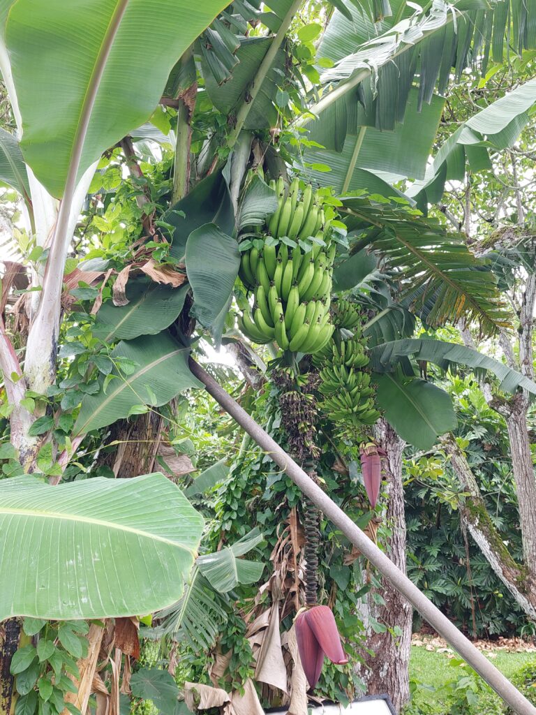 Mangos und Bananen im Garten; der Ozean gegenüber der Einfahrt