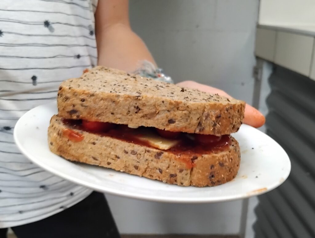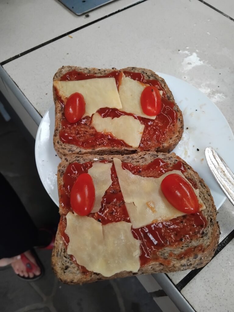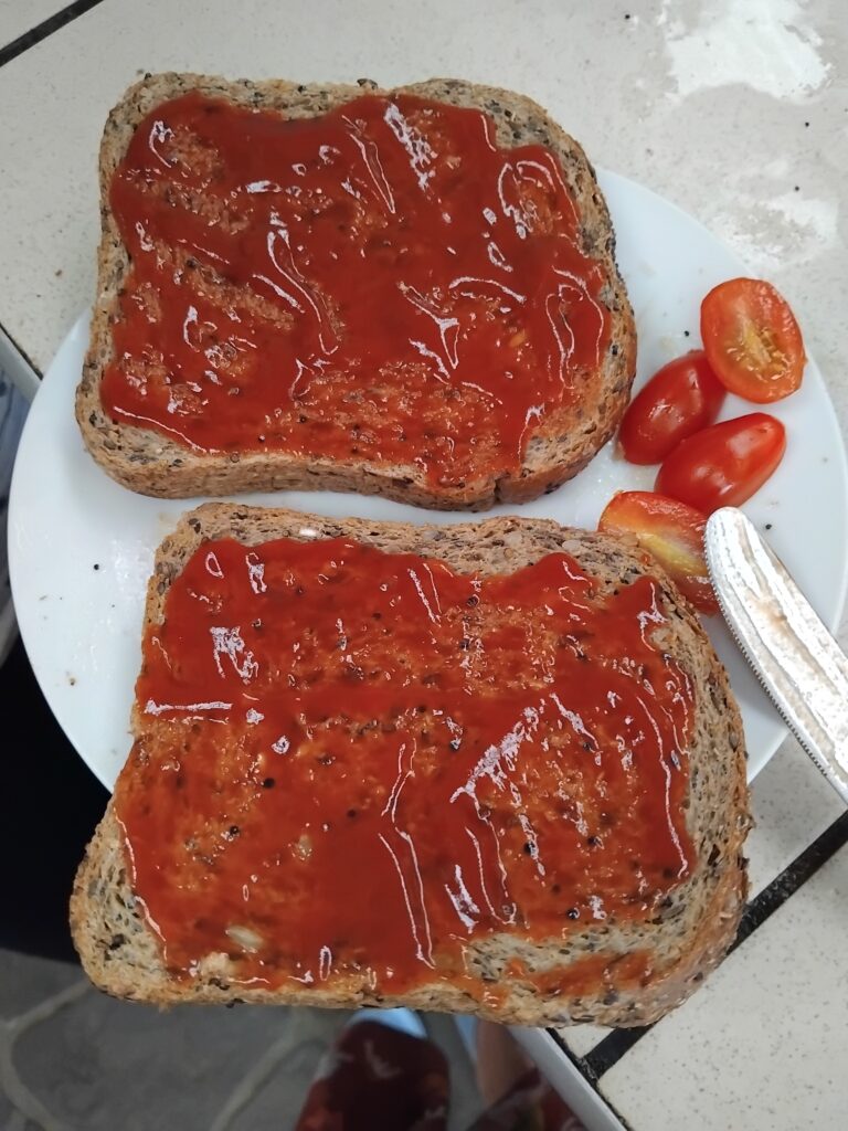 Heute hatte ich Hunger, verständlich jeder hat Hunger also musste ich etwas essen. Ich habe mich dazu entschieden ein Sandwich zu essen, da wir unsere Reste essen müssen. Die Reste heißt frische Lebensmittel die man nicht so einfach mit in den Flieger nehmen kann. Jetzt heißt es Külschrank auf und gucken was drinnen ist. Da steht eine Flasche Ketchup, die aber schon fast leer ist, außerdem eine Packung Käse die ebenfalls fast leer ist, eine Packung kleiner Tomaten und Eine Tüte dunkles Toastbrot. Perfekt!!! Nun hieß es nachdenken, am Ende bin ich zu dem Entschluss gekommen ein eigenes Reste -Sandwich zu kreieren. Falls es euch interessiert wie es geht, dann lest weiter, sonst sage ich tschüss, da dieser Beitrag dann zu Ende ist.