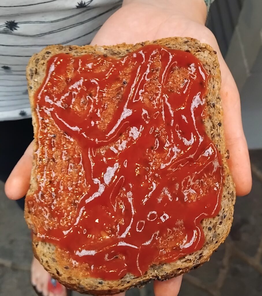 Schritt 2.: Beschmiere nun dein Brot mit Ketchup, nimm so viel wie du denkst, dass es gut für dich ist und dass es dir schmeckt.