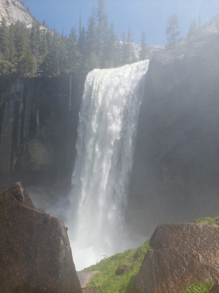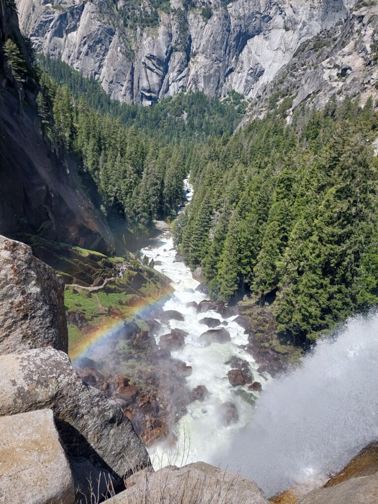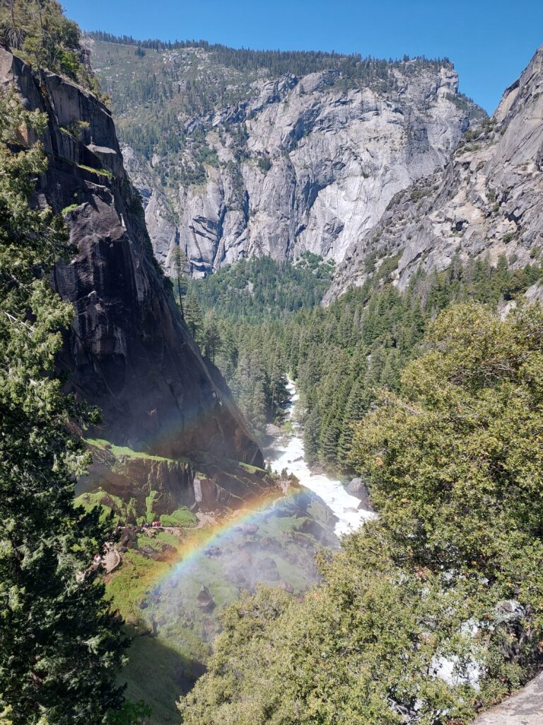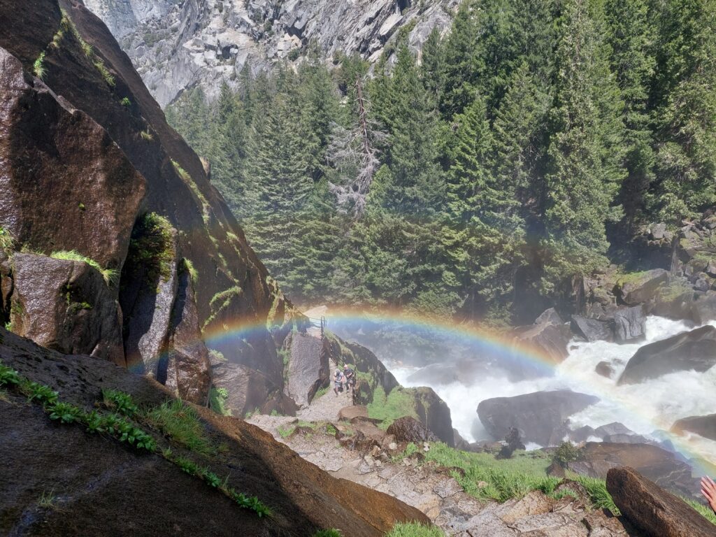 Der Mist Trail macht im Frühjahr seinem Namen alle Ehre. Sobald man den Teil des Weges direkt neben dem Vernal Fall erreicht wird man regelrecht geduscht. Anfangs habe ich mich noch gefragt, warum andere Wanderer große Regencapes übergezogen haben….wir waren oben wie geduscht, aber durch den Regenbogen zu laufen war unbezahlbar.