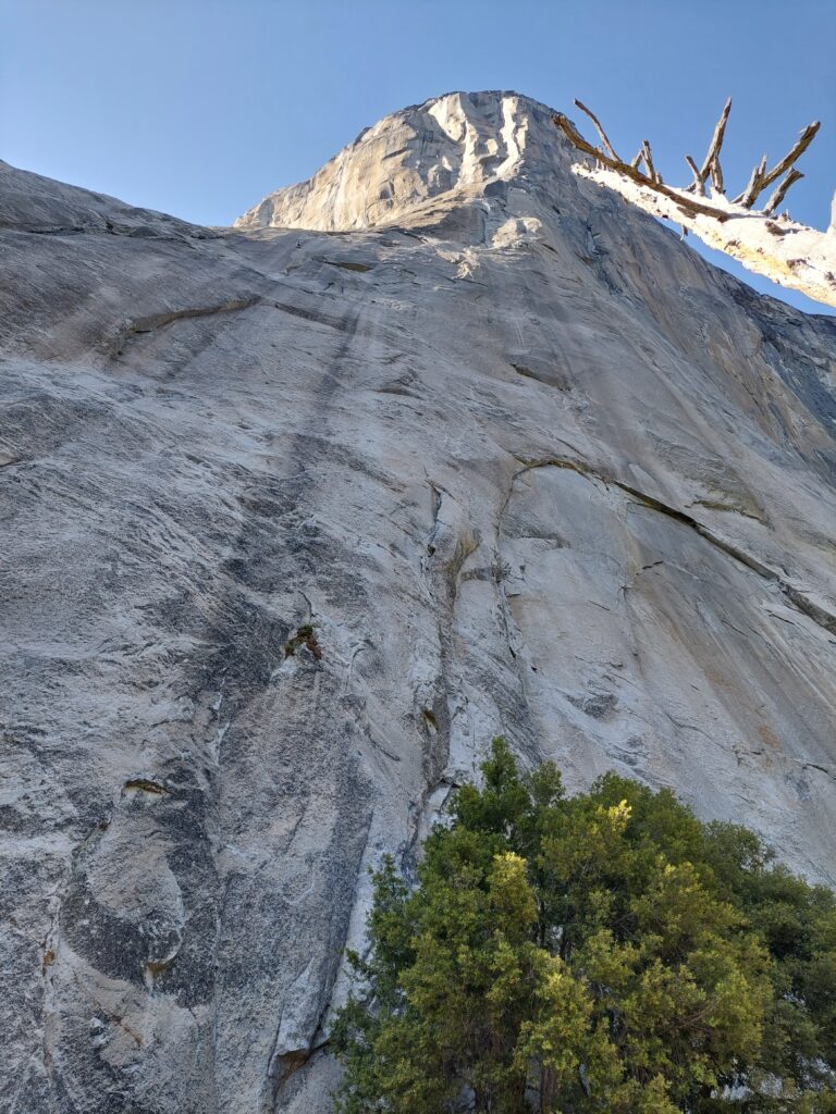 Wir haben unten gestanden und hochgeschaut. Wir haben zwei Kletterern beim Fertigmachen zugesehen und sind selber zwei, drei Meter in die Wand gegangen. Wir haben hoch in der Wand ein Nacht-Biwak gesehen, in dem ein Kletterer auf einem in der Wand hängenden Feldbett schläft bis er oder sie bei Tagesanbruch erneut weiter klettern kann. Und wir haben uns die ganze Zeit gefragt wie es möglich ist, dass da jemand ganz allein und ohne Sicherung hochkommt…