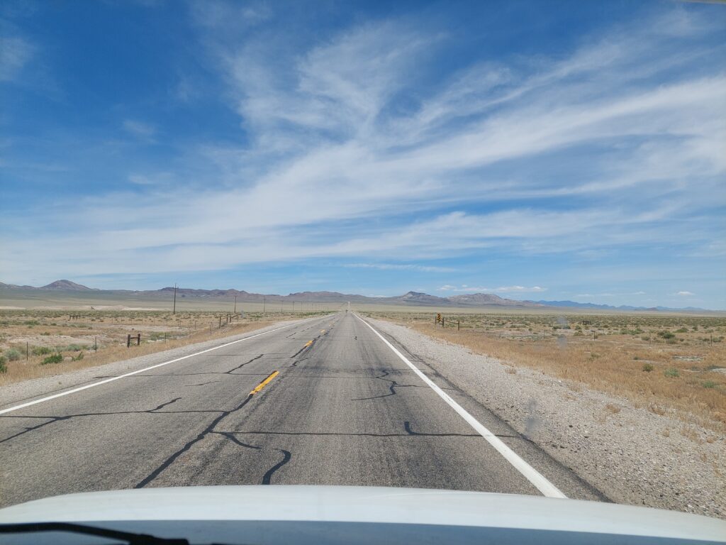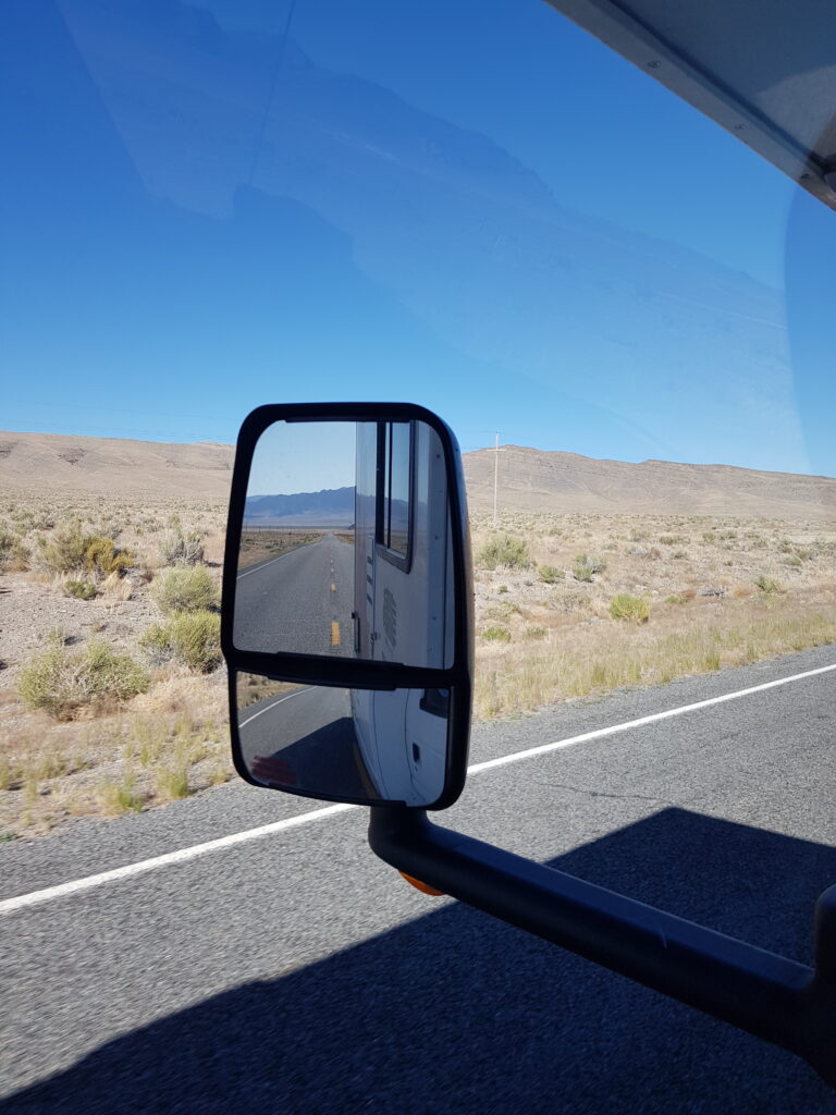 Wieder konnten wir anhand der Sierra Nevada eindrucksvoll sehen, was Niederschlagsmengen für die Vegetation bedeuten. Während westlich bis zur Passhöhe Bäumen wachsen, wird es im Osten, im Schatten der Berge sehr schnell trocken und die Bäume werden von Büschen und kleinen Sträuchern abgelöst. ‚Hinter’der Sierra Nevada ist tatsächlich auch noch Californien, aber die Grenze zu Nevada ist bald erreicht. Wir wollten diesmal über Salt Lake City zum Yellowstone Nationalpark fahren, allein, es liegt viel Land dazwischen. Da passte es gut, dass Moritz in einem Reiseführer Bilder vom Great Basin Nationalpark gesehen hatte. Dieser ist unter den Nationalparks weniger bekannt und liegt im Norden Nevadas, nahe der Grenze zu Utah. Vor uns lag aber erst der ‚lonliest highway of the United States‘, entlang der 50 in Richtung Ely. Vor einem: Buschwerk, Wüste und die gerade Straße, hinter einem: Buschwerk, Wüste und die gerade Straße. 18 Meilen ohne Kurve! Aber im Gegensatz zum Süden Nevadas, wo alles flach ist, erheben sich hier am Horizont immer wieder hohe Berge und in den Senken dazwischen grüne Inseln. Hier rollen wie im Western ‚dust devils‘ über die Straße und sieht man Klapperschlangen als ‚roadkill‘. Leben möchte ich hier nicht, aber diese UNENDLICHE Weite zu durchfahren ist ein tolles Erlebnis! SO VIEL PLATZ!