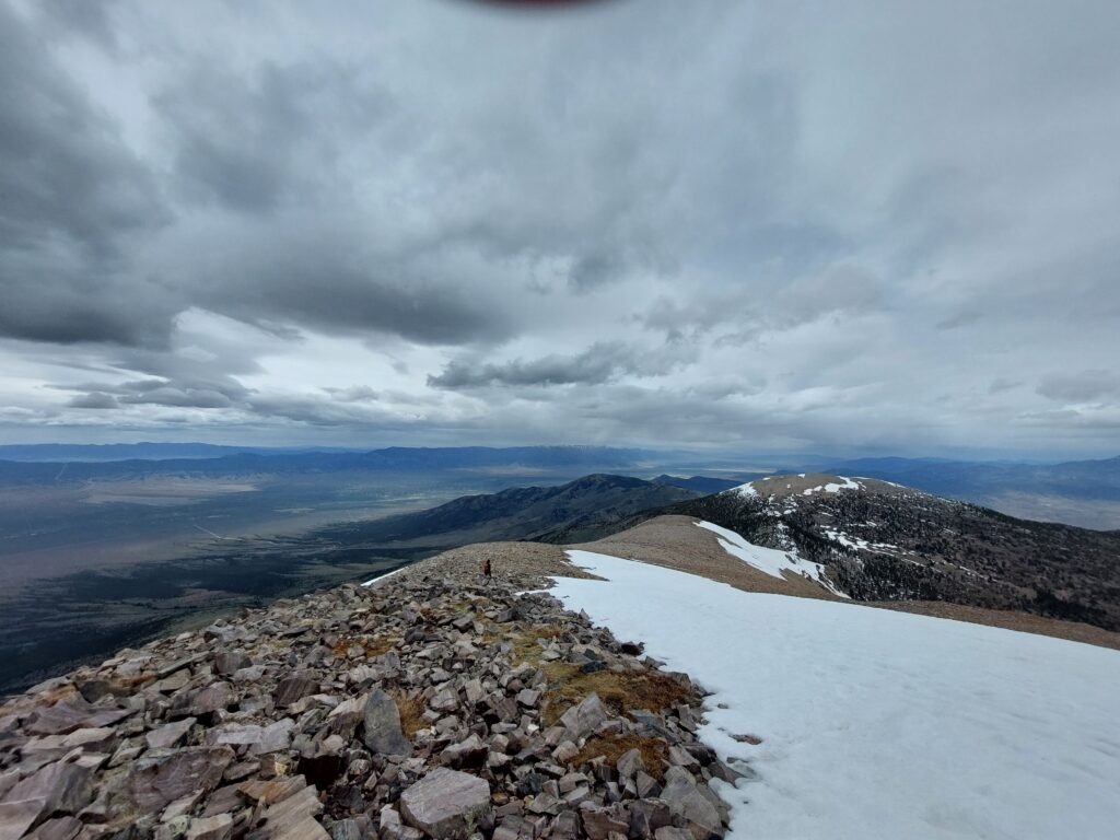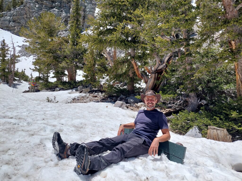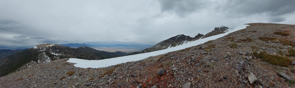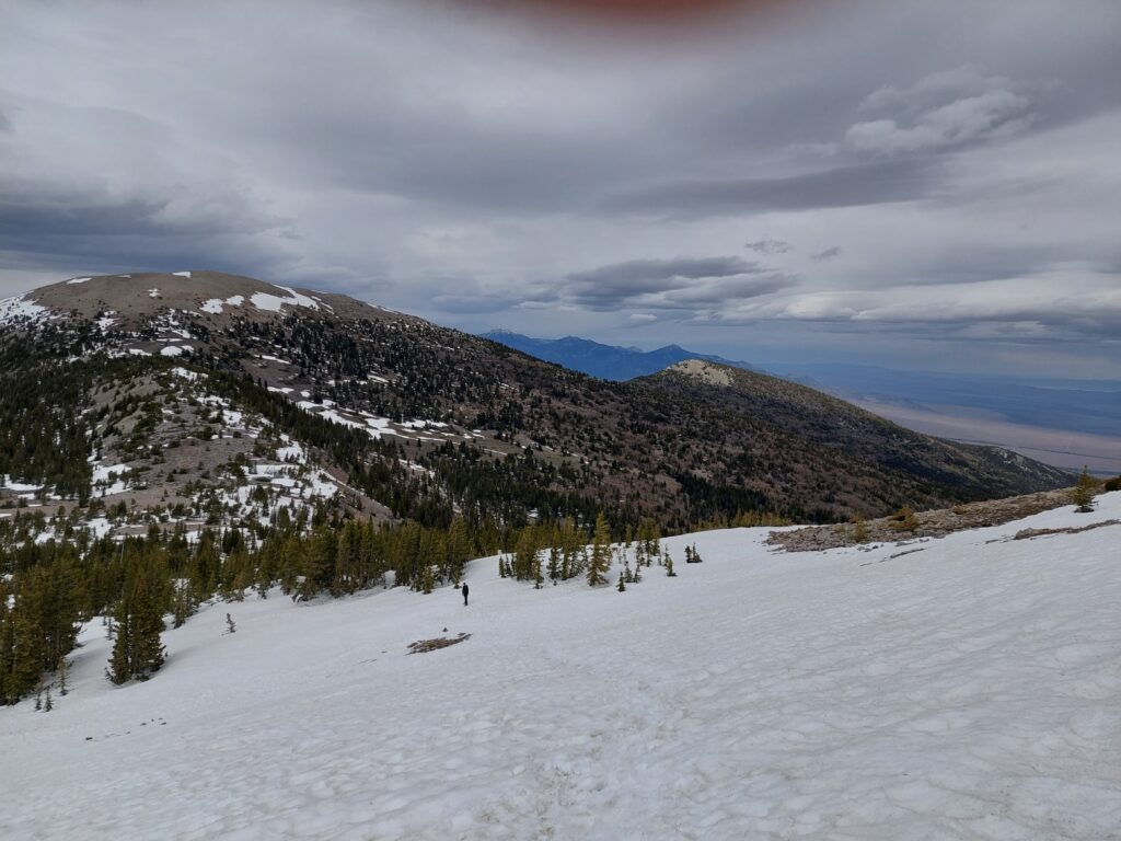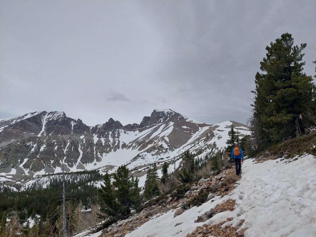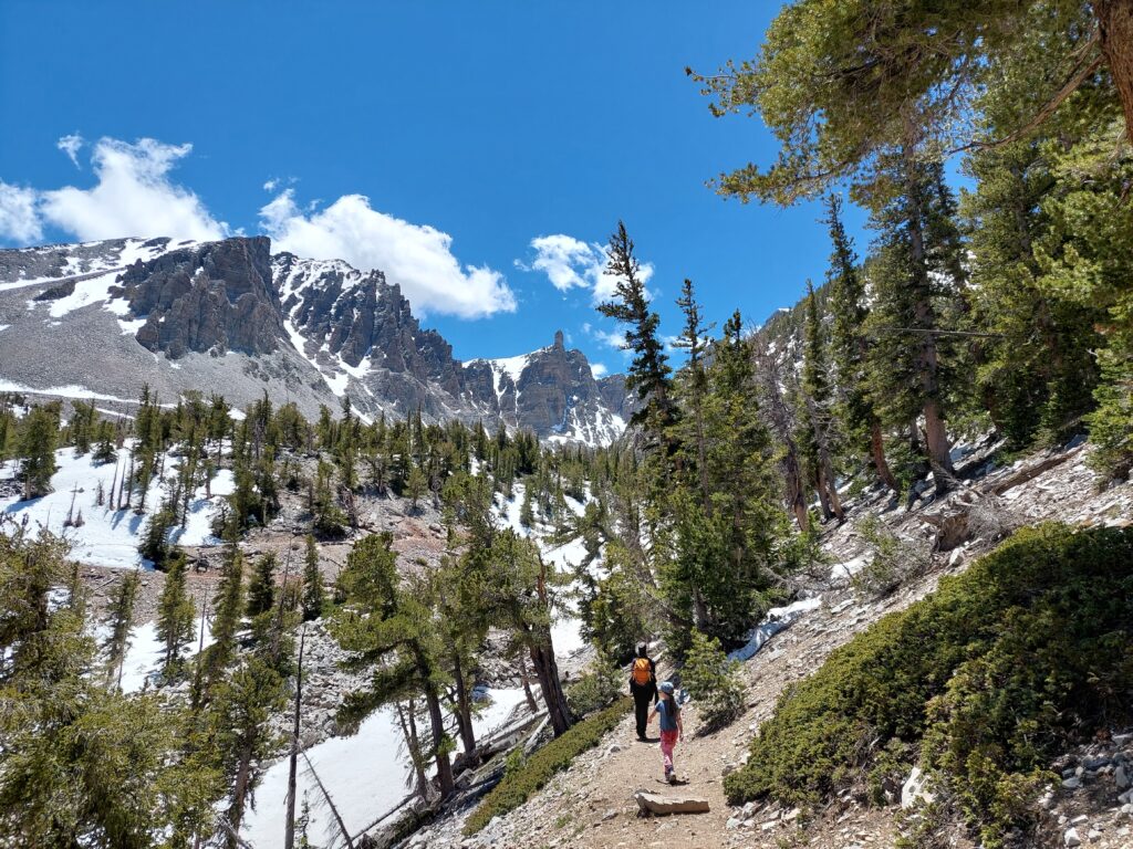 Bereits bei den Tälern handelt es sichbum Hochebenen, die knapp 2000 Meter über dem Meeresspiegel liegen und die Gipfel der Bergketten steigen bis auf 4000 Meter über dem Meer an. Dementsprechend hielt der Frühling hier noch sehr verhalten Einzug. In der Information hatte man uns gewarnt, dass die hochgelegenen Regionen des Parks ob des Schnees nicht ohne Spikes und Stöcke zu bewandern wären. Moritz und ich wollten es trotzdem versuchen und den Gipfel des Mt.Wheeler erklimmen. Die Mädchen sind lieber auf dem Campingplatz geblieben.