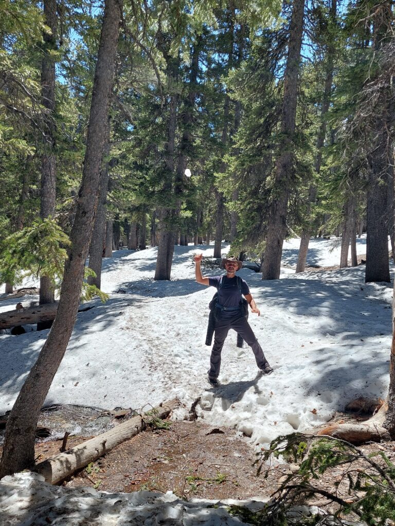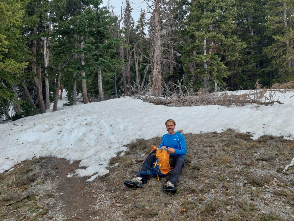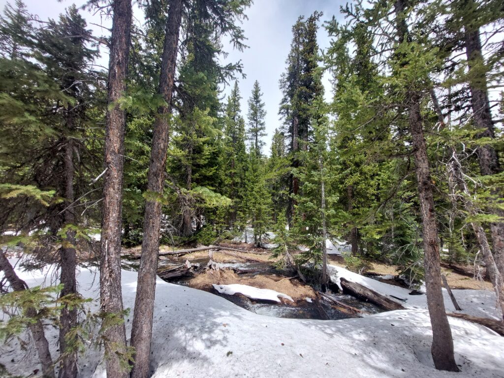 Zwischen den Bäumen lag der Schnee teilweise noch über einen Meter hoch, aber hier konnten wir immer noch einen Weg über die Schneefelder finden.