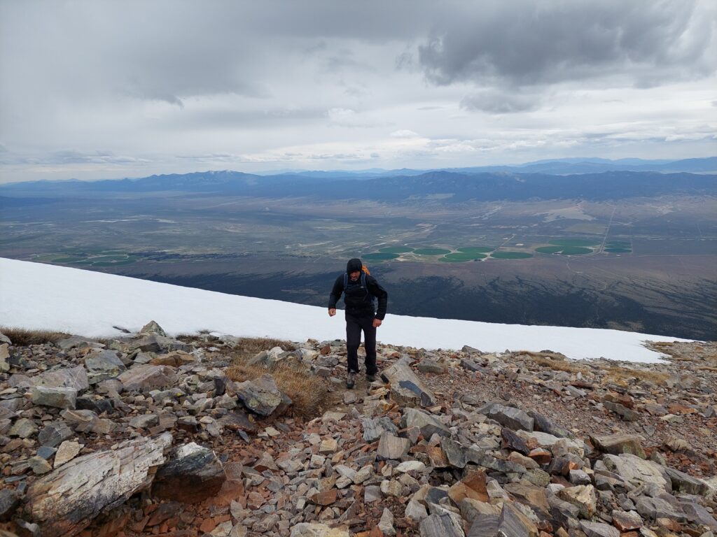 Anders sah es hingegen auf dem letzten Stück in Richtung Gipfel aus. Wir hatten einen SEHR windigen Tag erwischt. Der Wind hatte den ganzen Grat schneefrei geblasen, drohte aber auch uns vom Berg zu wehen. Nachdem wir uns noch einige hundert Meter schwer aufrecht stehend dem Gipfel entgegen gestemmt hatten, entschieden wir uns 200m unterhalb umzudrehen. Ohne Sicherung wäre es in der hochalpinen Gegend wohl zu gefährlich geworden. Einen anderen Wanderer haben wir dort oben getroffen, der von seinem ‚windiest hike ever‘ sprach.