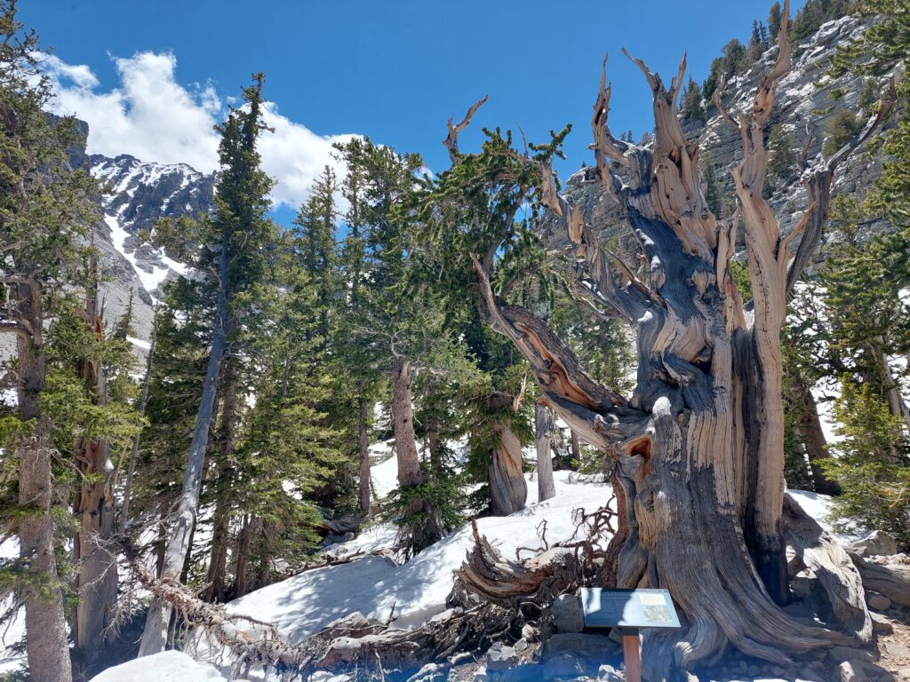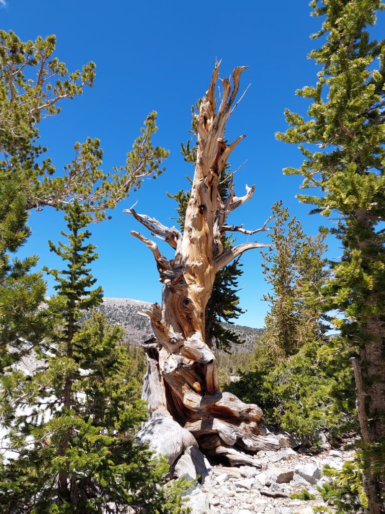 Einer der ältesten Bäume der Erde vor dem Panorama des Mount Wheeler