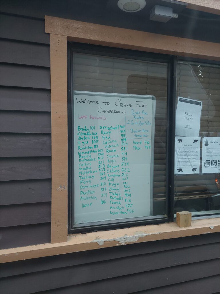 Der Yosemite Park stand als Wunschziel für diesen Reiseabschnitt ganz oben auf der Liste. Beim letzten Mal sind wir nur bis zur Eingangspforte gekommen. Anfang April lag damals noch so viel Schnee, dass der Park nur mit Schneeketten zu befahren war, die wir für unseren Mietcamper (noch) nicht hatten. Diesmal kamen wir aus Richtung Süden und hatten Glück, dass tags zuvor der Crane Flat Campground für die Saison eröffnet wurde. Allein dadurch hatten wir eine Chance noch einen Platz im Park reservieren zu können. Im Gegensatz zu früher werden die Plätze heute nicht mehr von den anwesenden Rangern nach dem ‚first come – first serve Prinzip‘ vergeben, sondern sind zentral über die reservation.gov Homepage buchbar. Auf dieser Homepage kann man alle Nationalparkcampingplätze in den USA, sowie alle weiteren erforderlichen Permits für die Nationalparks beantragen und bezahlen. Das ist wirklich praktisch – so lange man Internet hat. Empfangen wurden wir als late-arrivals aber ganz old school auf einer Tafel am Tor. Zeit für unser erstes Lagerfeuer blieb auch noch.