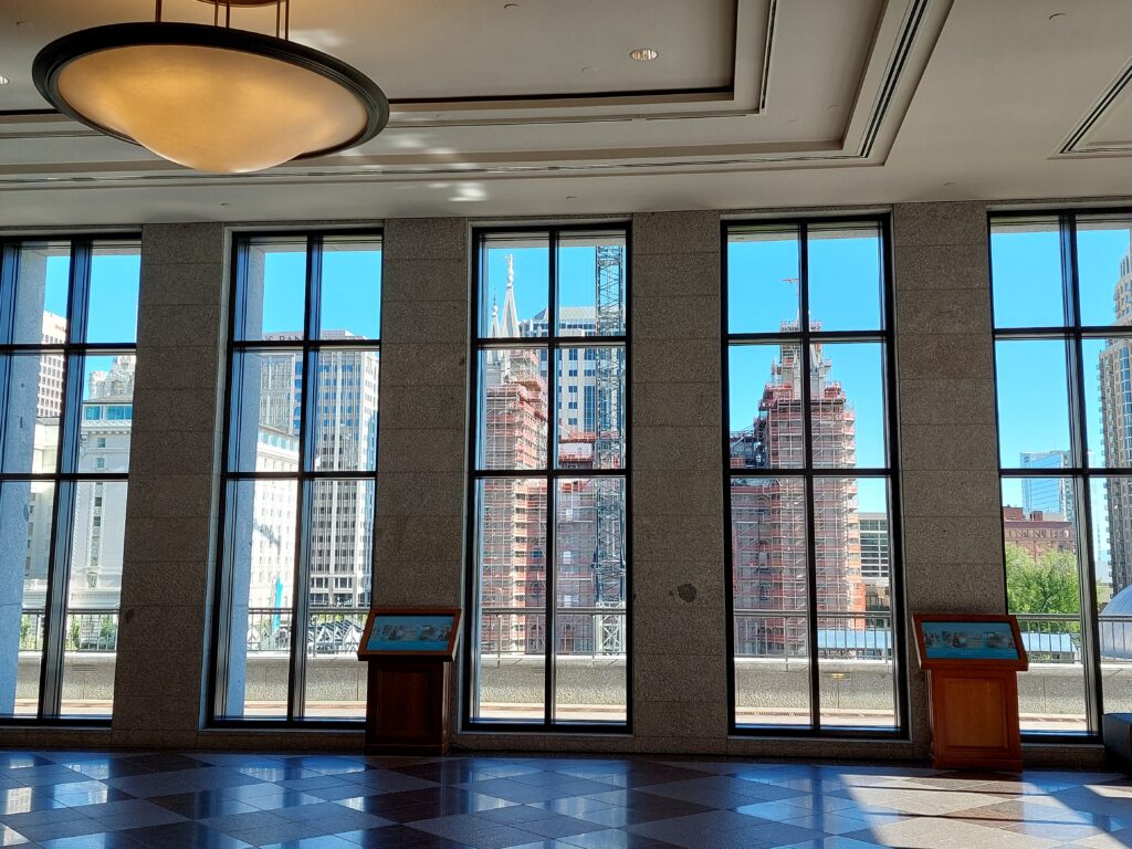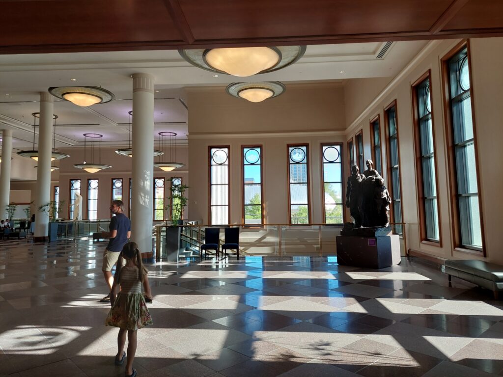 Die Straßen in der Innenstadt sind, wie oft in den USA, im Schachbrettmuster angelegt. Sie werden aber nicht wie sonst durchnummeriert, sondern entsprechend ihrer Entfernung zum Tempel in yards bezeichnet: 200st west, 300st north usw.. Um die riesigen Verwaltungsgebäude konnten wir herumlaufen und das große Conferencecenter durften wir besichtigen.