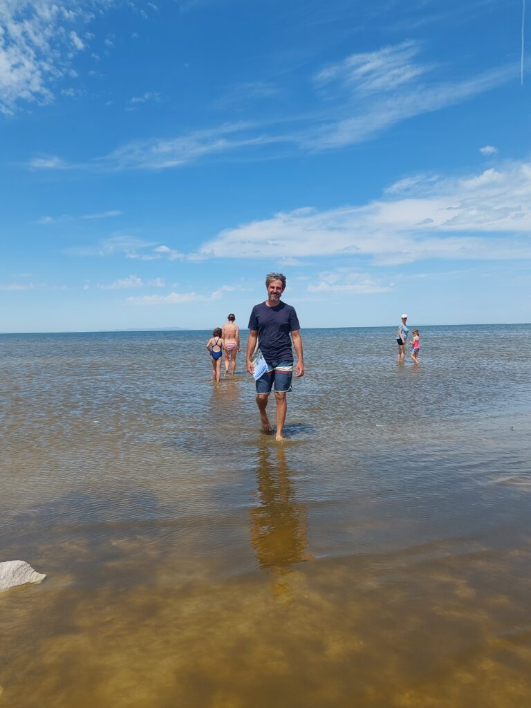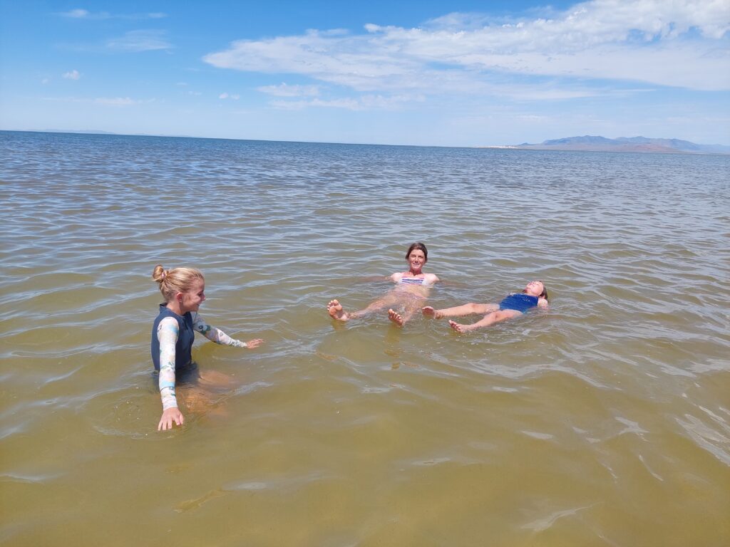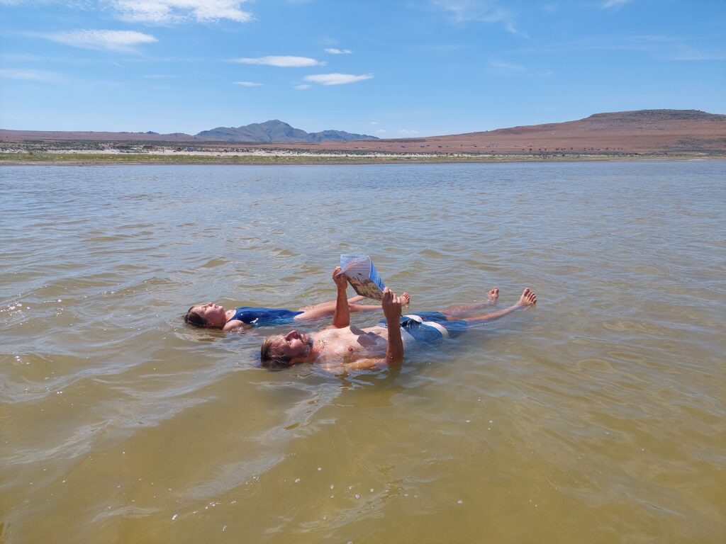 Auch wenn das Wasser des Sees nicht besonders verlockend roch wollte Moritz am letzten Tag unbedingt noch ausprobieren, ob bei 14% Salzgehalt das gleiche für den See, wie für das noch salzigere Tote Meer gilt: Kann man sich wirklich darauflegen und Zeitung lesen?